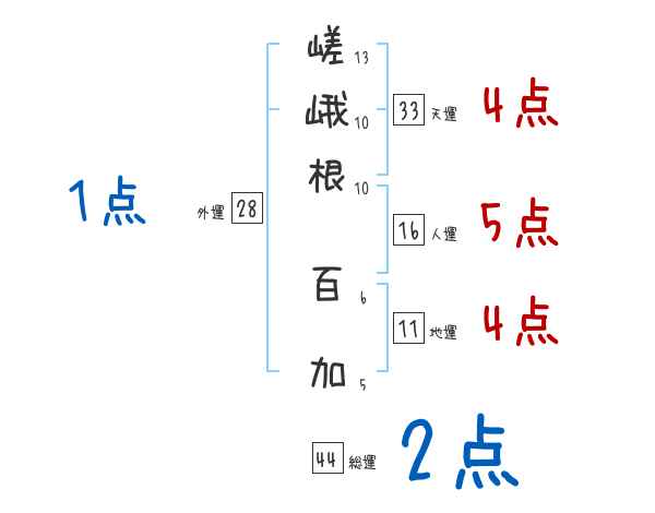 天運![]() | 嵯峨根百加さんの天運は33画の4つ星!権力志向でプライドが高い。勇気があり運を切り開き成功する。 家系が持つ宿命的な運勢を表します。祖先から受け継いだ苗字ですので自分の力が及びません。家柄を象徴します。 |