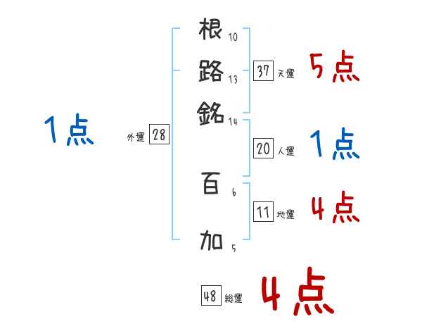 外運![]() | 根路銘百加さんの外運は28画の1つ星!家庭環境に注意。スポーツで活躍できる能力があるかも。 生活面を象徴する運勢です。外部から受ける影響力を表し、結婚運、家庭運や職場、環境への順応性を表します。 |