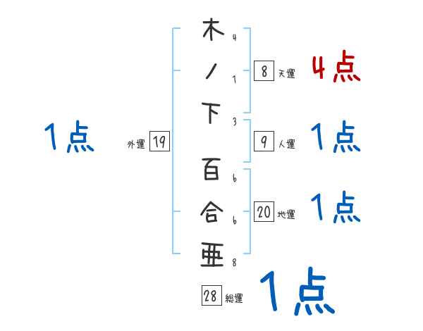 総運![]() | 木ノ下百合亜さんの総運は28画の1つ星!家庭環境に注意。スポーツで活躍できる能力があるかも。 あなたの人生を表す1番重要な運勢です。生涯を通じて影響する総合運となり、主に50歳以降の晩年期に影響を及ぼします。 |
