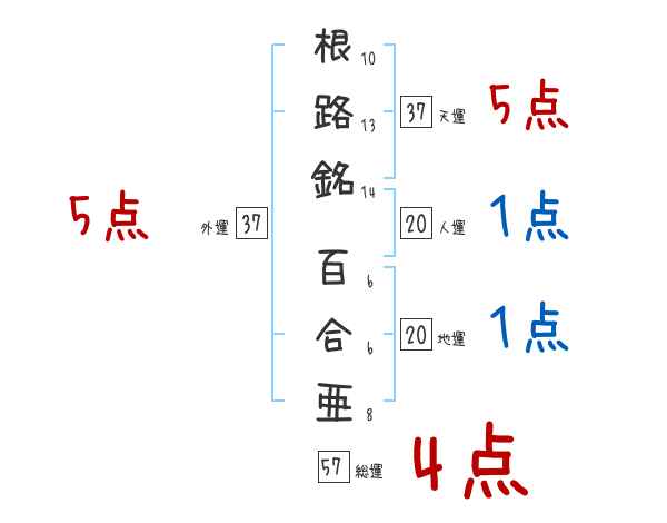 総運![]() | 根路銘百合亜さんの総運は57画の4つ星!向上心があり人望がある。地位を得る。 あなたの人生を表す1番重要な運勢です。生涯を通じて影響する総合運となり、主に50歳以降の晩年期に影響を及ぼします。 |