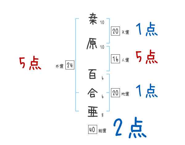 人運![]() | 桒原百合亜さんの人運は16画の5つ星!人望が厚く大きく発展する。逆転成功が見える。 性格や才能などを表す2番目に重要な運勢です。人間関係や協調性、社会的な成功に影響します。主に20歳から50歳ぐらいまでの中年期の運勢を表します。 |