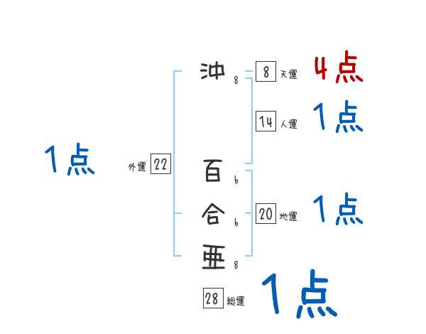 天運![]() | 沖百合亜さんの天運は8画の4つ星!勤勉家。根気強く努力し成功する。忍耐力がある。 家系が持つ宿命的な運勢を表します。祖先から受け継いだ苗字ですので自分の力が及びません。家柄を象徴します。 |