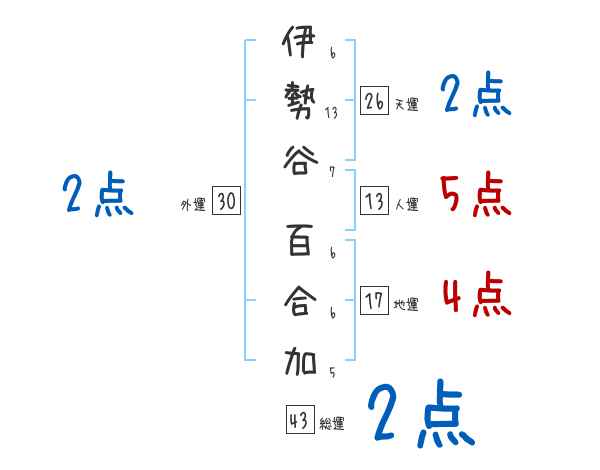 天運![]() | 伊勢谷百合加さんの天運は26画の2つ星!波瀾万丈かも。信頼できる人を大事にしましょう。 家系が持つ宿命的な運勢を表します。祖先から受け継いだ苗字ですので自分の力が及びません。家柄を象徴します。 |