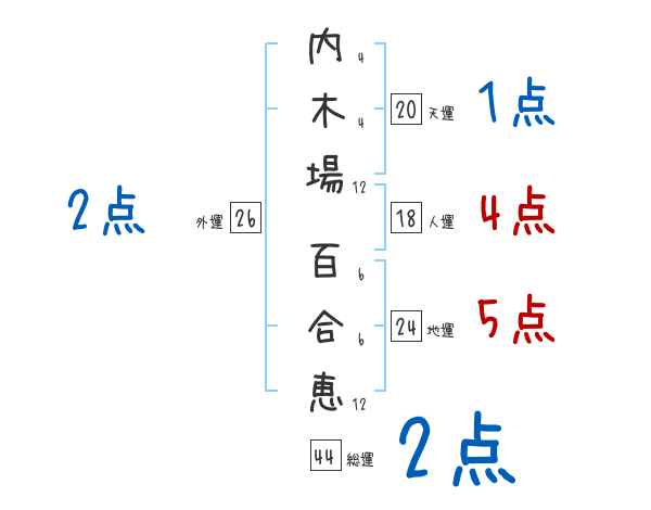 外運![]() | 内木場百合恵さんの外運は26画の2つ星!波瀾万丈かも。信頼できる人を大事にしましょう。 生活面を象徴する運勢です。外部から受ける影響力を表し、結婚運、家庭運や職場、環境への順応性を表します。 |