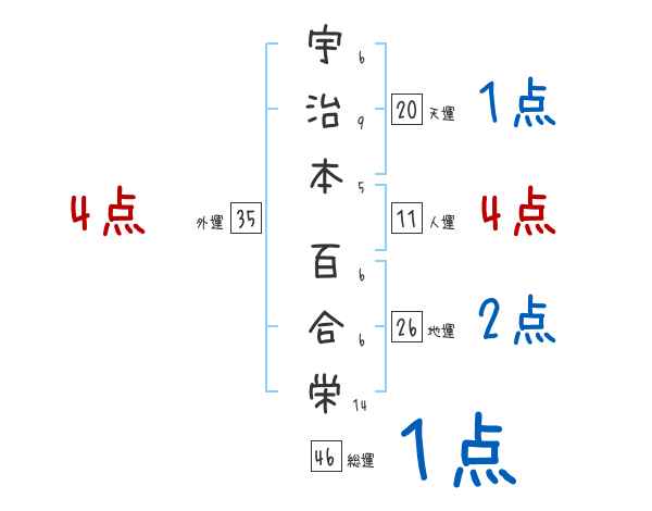 外運![]() | 宇治本百合栄さんの外運は35画の4つ星!温厚な性格で感受性が高い。穏和な性格で人望が厚い。 生活面を象徴する運勢です。外部から受ける影響力を表し、結婚運、家庭運や職場、環境への順応性を表します。 |