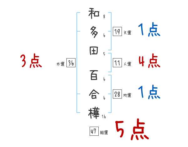 総運![]() | 和多田百合樺さんの総運は47画の5つ星!実力が開花し発展する円満な人生。財に恵まれる。 あなたの人生を表す1番重要な運勢です。生涯を通じて影響する総合運となり、主に50歳以降の晩年期に影響を及ぼします。 |