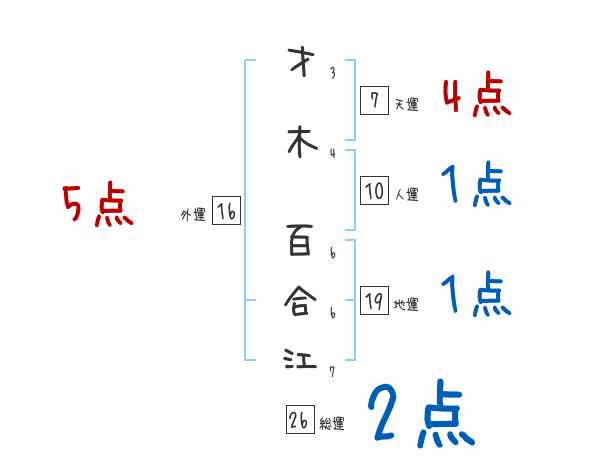 天運![]() | 才木百合江さんの天運は7画の4つ星!強い意志や信念を持ち独立心が強い。自立する。 家系が持つ宿命的な運勢を表します。祖先から受け継いだ苗字ですので自分の力が及びません。家柄を象徴します。 |