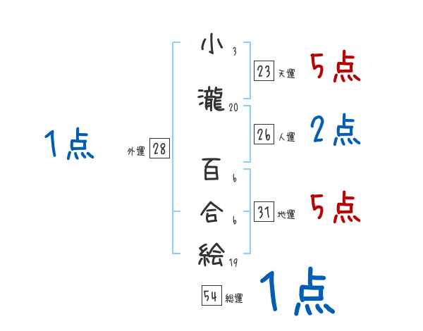 天運![]() | 小瀧百合絵さんの天運は23画の5つ星!想像力に優れ活力がある。一代で成功し名誉を手に入れる。 家系が持つ宿命的な運勢を表します。祖先から受け継いだ苗字ですので自分の力が及びません。家柄を象徴します。 |