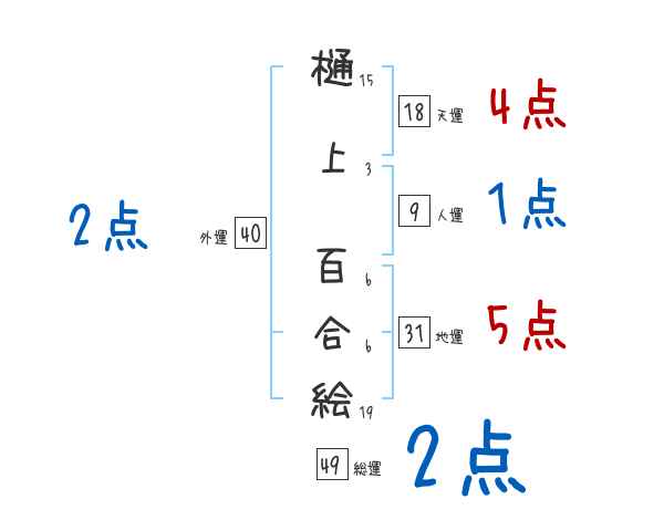 外運![]() | 樋上百合絵さんの外運は40画の2つ星!自信過剰で物事に固執するためトラブルに注意。 生活面を象徴する運勢です。外部から受ける影響力を表し、結婚運、家庭運や職場、環境への順応性を表します。 |