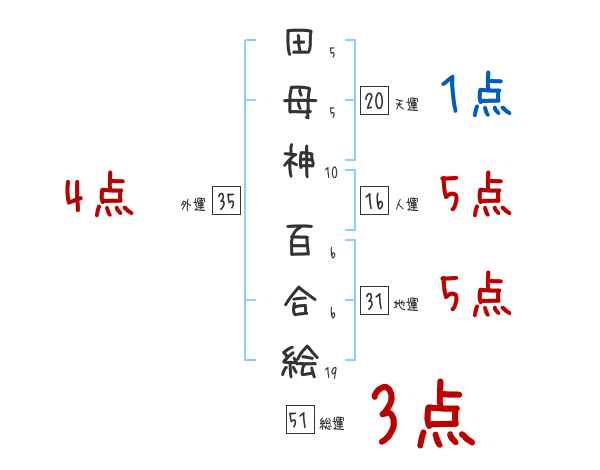 外運![]() | 田母神百合絵さんの外運は35画の4つ星!温厚な性格で感受性が高い。穏和な性格で人望が厚い。 生活面を象徴する運勢です。外部から受ける影響力を表し、結婚運、家庭運や職場、環境への順応性を表します。 |