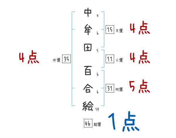 総運![]() | 中牟田百合絵さんの総運は46画の1つ星!迷走することが多く苦労するかも。目先のことにとらわれないように。 あなたの人生を表す1番重要な運勢です。生涯を通じて影響する総合運となり、主に50歳以降の晩年期に影響を及ぼします。 |