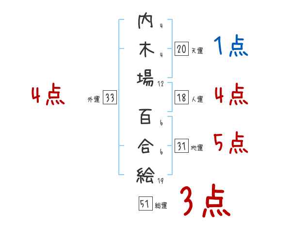 人運![]() | 内木場百合絵さんの人運は18画の4つ星!情熱的で剛気。忍耐力があり信頼される。 性格や才能などを表す2番目に重要な運勢です。人間関係や協調性、社会的な成功に影響します。主に20歳から50歳ぐらいまでの中年期の運勢を表します。 |