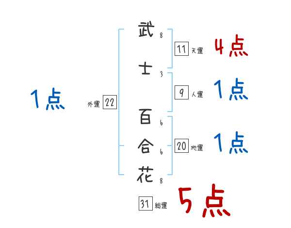 人運![]() | 武士百合花さんの人運は9画の1つ星!消極的で才能を発揮することが苦手なことも。周りの意見に耳を傾けましょう。 性格や才能などを表す2番目に重要な運勢です。人間関係や協調性、社会的な成功に影響します。主に20歳から50歳ぐらいまでの中年期の運勢を表します。 |