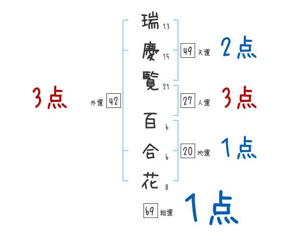 天運![]() | 瑞慶覧百合花さんの天運は49画の2つ星!不安定な性格で明暗がある人生。周りの人には支援されやすい。 家系が持つ宿命的な運勢を表します。祖先から受け継いだ苗字ですので自分の力が及びません。家柄を象徴します。 |