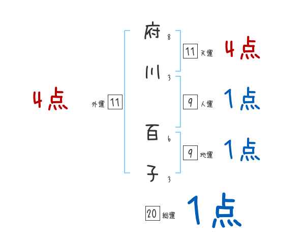 天運![]() | 府川百子さんの天運は11画の4つ星!着実に富や地位を得る幸運な人生。 家系が持つ宿命的な運勢を表します。祖先から受け継いだ苗字ですので自分の力が及びません。家柄を象徴します。 |