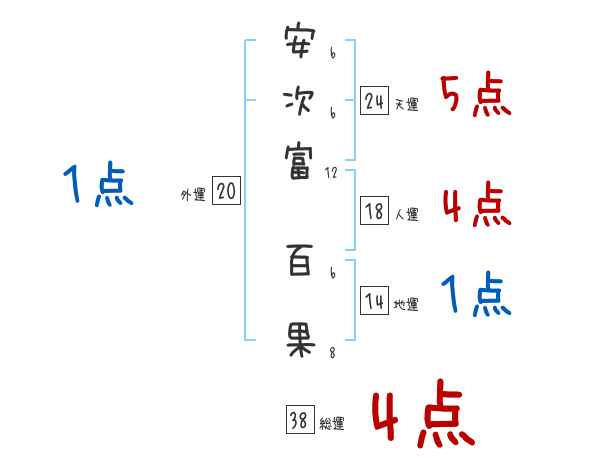 天運![]() | 安次富百果さんの天運は24画の5つ星!家庭運が良く順調な人生。金運にも恵まれる。 家系が持つ宿命的な運勢を表します。祖先から受け継いだ苗字ですので自分の力が及びません。家柄を象徴します。 |