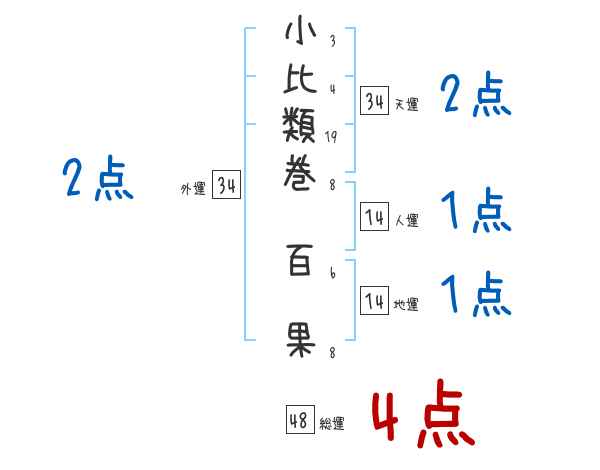 天運![]() | 小比類巻百果さんの天運は34画の2つ星!独創性に優れるが、自尊心が強く災難に注意しましょう。 家系が持つ宿命的な運勢を表します。祖先から受け継いだ苗字ですので自分の力が及びません。家柄を象徴します。 |