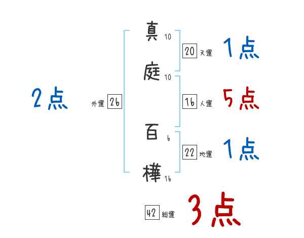 人運![]() | 真庭百樺さんの人運は16画の5つ星!人望が厚く大きく発展する。逆転成功が見える。 性格や才能などを表す2番目に重要な運勢です。人間関係や協調性、社会的な成功に影響します。主に20歳から50歳ぐらいまでの中年期の運勢を表します。 |