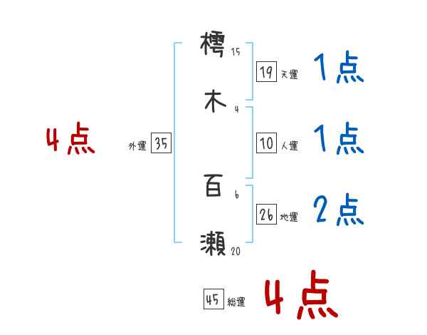外運![]() | 樗木百瀬さんの外運は35画の4つ星!温厚な性格で感受性が高い。穏和な性格で人望が厚い。 生活面を象徴する運勢です。外部から受ける影響力を表し、結婚運、家庭運や職場、環境への順応性を表します。 |