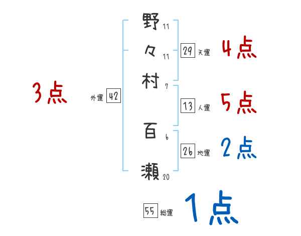 天運![]() | 野々村百瀬さんの天運は29画の4つ星!完全主義で才能がある。厳格な心の持ち主。 家系が持つ宿命的な運勢を表します。祖先から受け継いだ苗字ですので自分の力が及びません。家柄を象徴します。 |