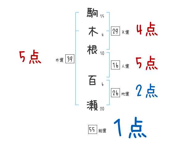 外運![]() | 駒木根百瀬さんの外運は39画の5つ星!社交性に優れ人望が厚い。人の上に立ち成功する。 生活面を象徴する運勢です。外部から受ける影響力を表し、結婚運、家庭運や職場、環境への順応性を表します。 |