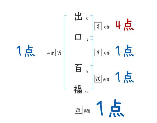 天運![]() | 出口百福さんの天運は8画の4つ星!勤勉家。根気強く努力し成功する。忍耐力がある。 家系が持つ宿命的な運勢を表します。祖先から受け継いだ苗字ですので自分の力が及びません。家柄を象徴します。 |