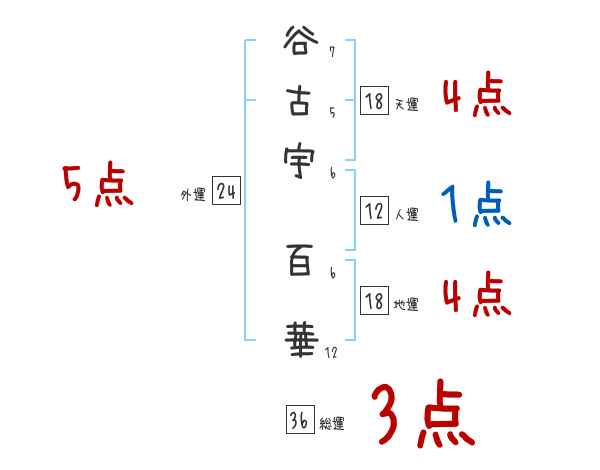 総運![]() | 谷古宇百華さんの総運は36画の3つ星!先見性が豊かです。多少神経質で苦労することも。 あなたの人生を表す1番重要な運勢です。生涯を通じて影響する総合運となり、主に50歳以降の晩年期に影響を及ぼします。 |