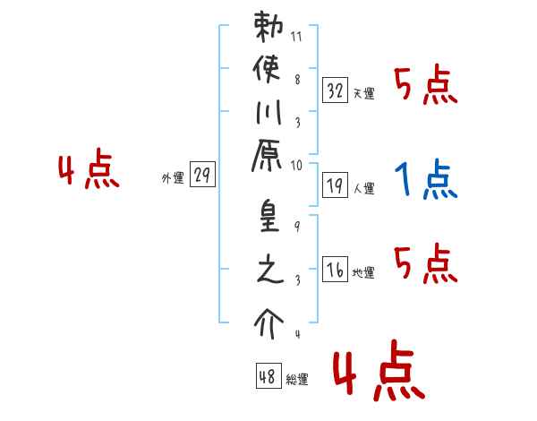 総運![]() | 勅使川原皇之介さんの総運は48画の4つ星!賢明な性格で人望が厚い。指導力があり多くの人に尊敬される。 あなたの人生を表す1番重要な運勢です。生涯を通じて影響する総合運となり、主に50歳以降の晩年期に影響を及ぼします。 |