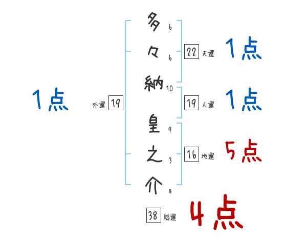 人運![]() | 多々納皇之介さんの人運は19画の1つ星!優れた才能を持ちますが、協調性が足りないことも。周りの人と協力する事を意識しましょう。 性格や才能などを表す2番目に重要な運勢です。人間関係や協調性、社会的な成功に影響します。主に20歳から50歳ぐらいまでの中年期の運勢を表します。 |