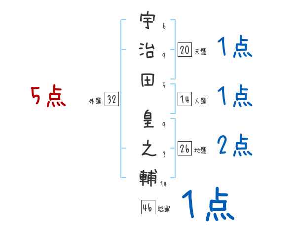 外運![]() | 宇治田皇之輔さんの外運は32画の5つ星!柔軟性があり成功する。チャンスが多く金運が良い。 生活面を象徴する運勢です。外部から受ける影響力を表し、結婚運、家庭運や職場、環境への順応性を表します。 |