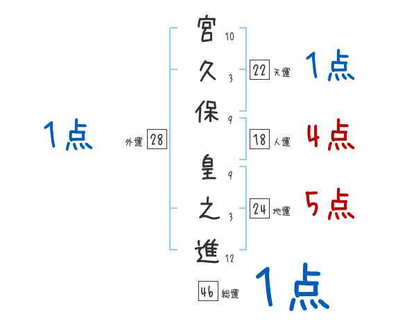 外運![]() | 宮久保皇之進さんの外運は28画の1つ星!家庭環境に注意。スポーツで活躍できる能力があるかも。 生活面を象徴する運勢です。外部から受ける影響力を表し、結婚運、家庭運や職場、環境への順応性を表します。 |