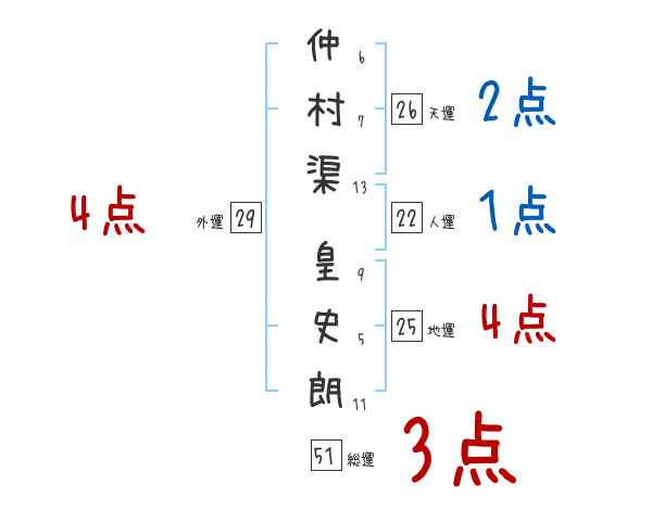 外運![]() | 仲村渠皇史朗さんの外運は29画の4つ星!完全主義で才能がある。厳格な心の持ち主。 生活面を象徴する運勢です。外部から受ける影響力を表し、結婚運、家庭運や職場、環境への順応性を表します。 |