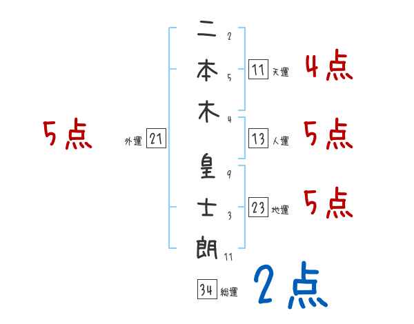 二本木皇士朗さんの画数の鑑定結果