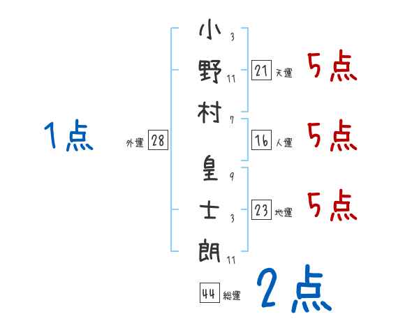 人運![]() | 小野村皇士朗さんの人運は16画の5つ星!人望が厚く大きく発展する。逆転成功が見える。 性格や才能などを表す2番目に重要な運勢です。人間関係や協調性、社会的な成功に影響します。主に20歳から50歳ぐらいまでの中年期の運勢を表します。 |