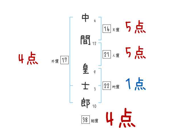 外運![]() | 中間皇士郎さんの外運は17画の4つ星!積極的な行動力。地位を気づき財産を手に入れる。純粋な心と直感力。 生活面を象徴する運勢です。外部から受ける影響力を表し、結婚運、家庭運や職場、環境への順応性を表します。 |