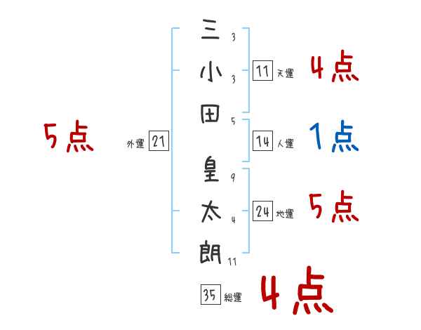 外運![]() | 三小田皇太朗さんの外運は21画の5つ星!統率力がある。独立し成功する。名誉を手に入れる。 生活面を象徴する運勢です。外部から受ける影響力を表し、結婚運、家庭運や職場、環境への順応性を表します。 |