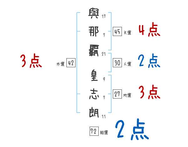 天運![]() | 與那覇皇志朗さんの天運は45画の4つ星!もくもくと物事を進め達成する。地味な努力家。 家系が持つ宿命的な運勢を表します。祖先から受け継いだ苗字ですので自分の力が及びません。家柄を象徴します。 |