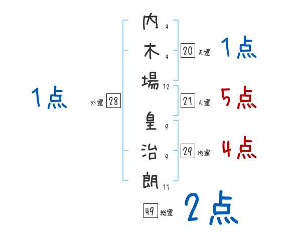 地運![]() | 内木場皇治朗さんの地運は29画の4つ星!完全主義で才能がある。厳格な心の持ち主。 個性を表す基礎的な運勢です。性格形成や対人関係、行動力など家庭環境に影響されます。主に誕生してから20歳くらいまでの若年期の運勢を表します。 |