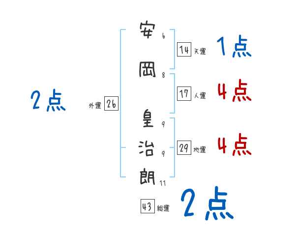 総運![]() | 安岡皇治朗さんの総運は43画の2つ星!頑固な性格で独立心が強いかも。やや非現実的で浪費に注意しましょう。 あなたの人生を表す1番重要な運勢です。生涯を通じて影響する総合運となり、主に50歳以降の晩年期に影響を及ぼします。 |