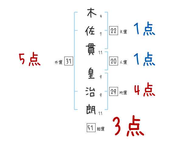 総運![]() | 木佐貫皇治朗さんの総運は51画の3つ星!変化が激しく、危険に注意。堅実な性格。 あなたの人生を表す1番重要な運勢です。生涯を通じて影響する総合運となり、主に50歳以降の晩年期に影響を及ぼします。 |
