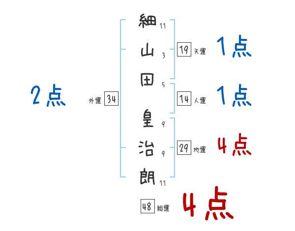 総運![]() | 細山田皇治朗さんの総運は48画の4つ星!賢明な性格で人望が厚い。指導力があり多くの人に尊敬される。 あなたの人生を表す1番重要な運勢です。生涯を通じて影響する総合運となり、主に50歳以降の晩年期に影響を及ぼします。 |