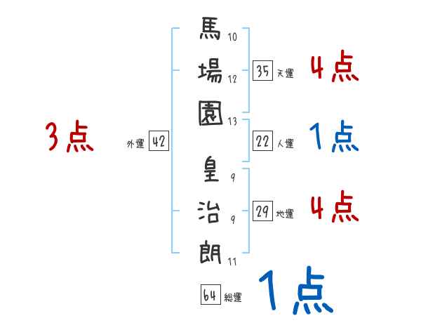 外運![]() | 馬場園皇治朗さんの外運は42画の3つ星!病気に注意。多芸であるが消極的でおとなしい。 生活面を象徴する運勢です。外部から受ける影響力を表し、結婚運、家庭運や職場、環境への順応性を表します。 |