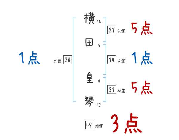 外運![]() | 横田皇琴さんの外運は28画の1つ星!家庭環境に注意。スポーツで活躍できる能力があるかも。 生活面を象徴する運勢です。外部から受ける影響力を表し、結婚運、家庭運や職場、環境への順応性を表します。 |