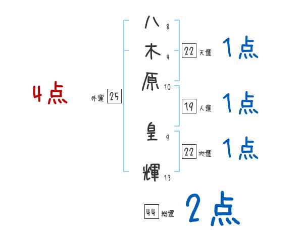 総運![]() | 八木原皇輝さんの総運は44画の2つ星!誠実で慎重な性格。物事を考えすぎないように注意しましょう。 あなたの人生を表す1番重要な運勢です。生涯を通じて影響する総合運となり、主に50歳以降の晩年期に影響を及ぼします。 |