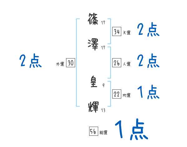 天運![]() | 篠澤皇輝さんの天運は34画の2つ星!独創性に優れるが、自尊心が強く災難に注意しましょう。 家系が持つ宿命的な運勢を表します。祖先から受け継いだ苗字ですので自分の力が及びません。家柄を象徴します。 |