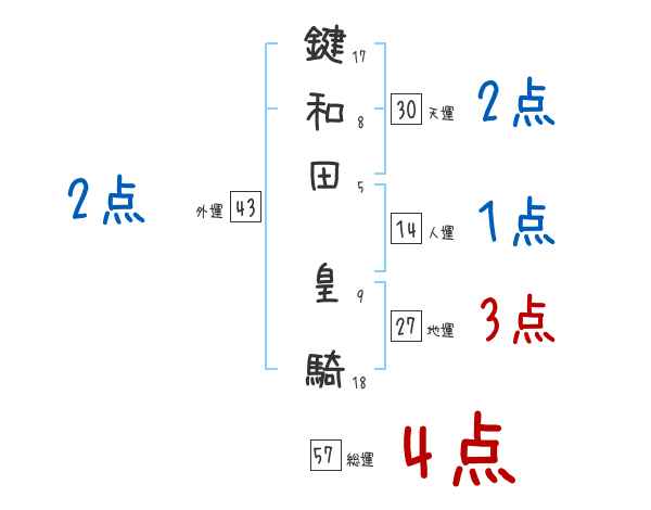 外運![]() | 鍵和田皇騎さんの外運は43画の2つ星!頑固な性格で独立心が強いかも。やや非現実的で浪費に注意しましょう。 生活面を象徴する運勢です。外部から受ける影響力を表し、結婚運、家庭運や職場、環境への順応性を表します。 |