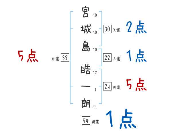 天運![]() | 宮城島皓一朗さんの天運は30画の2つ星!浮き沈みの激しさに注意しましょう。 家系が持つ宿命的な運勢を表します。祖先から受け継いだ苗字ですので自分の力が及びません。家柄を象徴します。 |