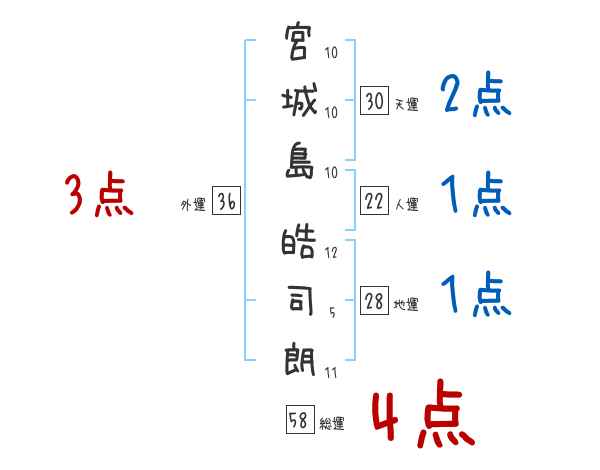 外運![]() | 宮城島皓司朗さんの外運は36画の3つ星!先見性が豊かです。多少神経質で苦労することも。 生活面を象徴する運勢です。外部から受ける影響力を表し、結婚運、家庭運や職場、環境への順応性を表します。 |