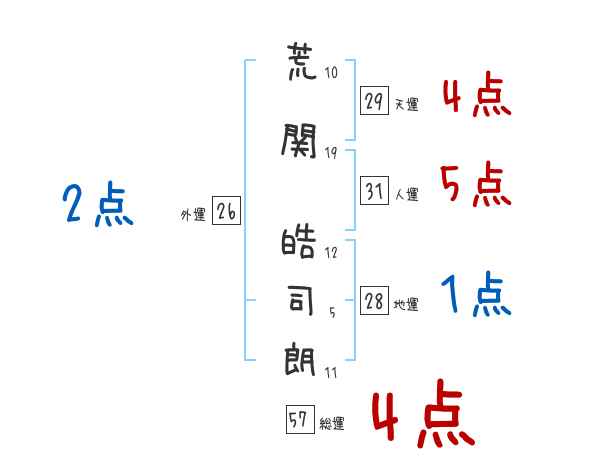 天運![]() | 荒関皓司朗さんの天運は29画の4つ星!完全主義で才能がある。厳格な心の持ち主。 家系が持つ宿命的な運勢を表します。祖先から受け継いだ苗字ですので自分の力が及びません。家柄を象徴します。 |