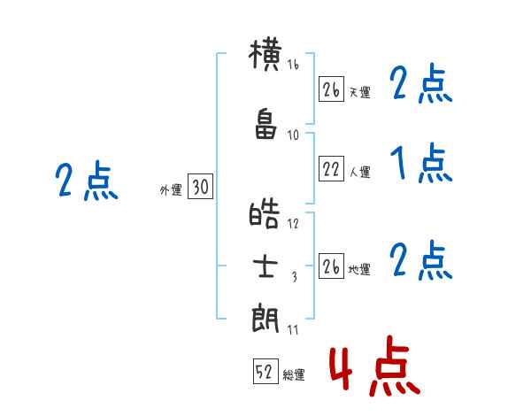 外運![]() | 横畠皓士朗さんの外運は30画の2つ星!浮き沈みの激しさに注意しましょう。 生活面を象徴する運勢です。外部から受ける影響力を表し、結婚運、家庭運や職場、環境への順応性を表します。 |